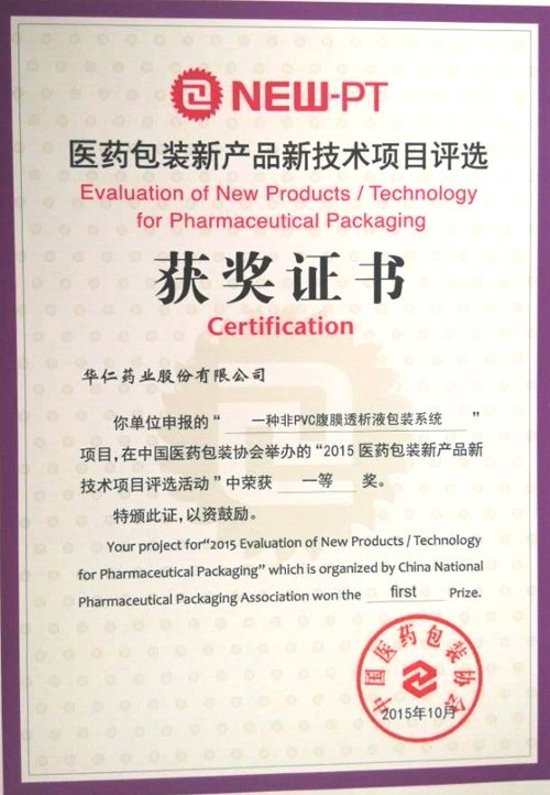 近日,華仁藥業(yè)藥品輸液包裝材料開發(fā)工作取得顯著成果,在輸液制袋膜材、配件接口以及全套非PVC腹膜透析液包裝系統(tǒng)不同環(huán)節(jié)共有三項(xiàng)課題獲得了2015年“新產(chǎn)品新技術(shù)項(xiàng)目評選活動(dòng)”兩個(gè)一等獎(jiǎng),一個(gè)二等獎(jiǎng)。