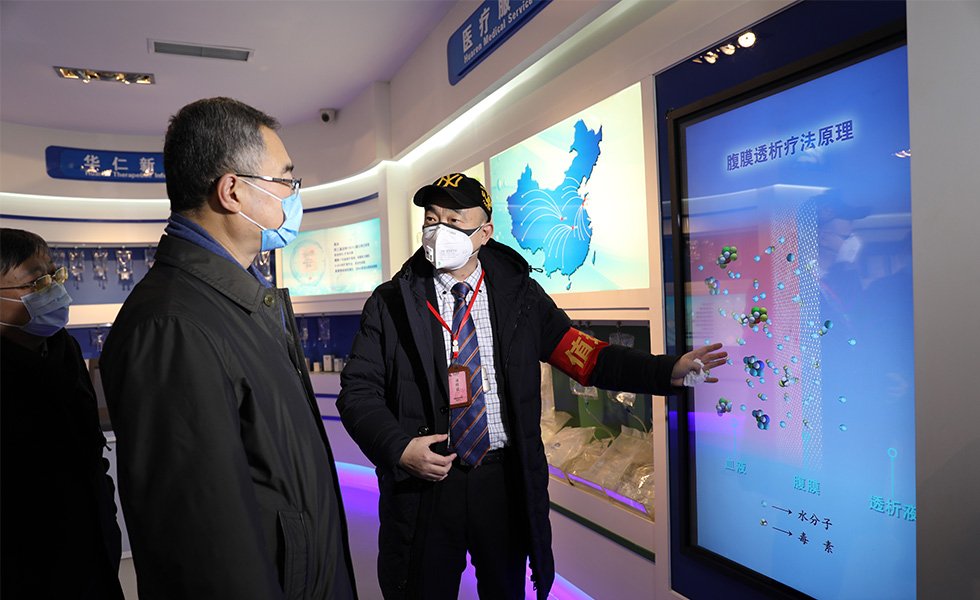 王書記首先到青島華仁輸液文化博物館進(jìn)行參觀調(diào)研,認(rèn)真聽取了楊董事長關(guān)于公司發(fā)展歷程、生產(chǎn)經(jīng)營、人才引進(jìn)、知識產(chǎn)權(quán)等的匯報。王書記在腹膜透析液產(chǎn)品介紹前駐足,在聽取了楊董事長的詳細(xì)介紹后,對華仁藥業(yè)在科技成果轉(zhuǎn)化方面工作表示肯定,對公司發(fā)展前景寄予厚望。隨后,王書記一行走進(jìn)公司一期生產(chǎn)車間現(xiàn)場實地調(diào)研公司疫情防控和復(fù)工復(fù)產(chǎn)情況。楊董事長介紹到,在武漢疫情發(fā)生后,各地醫(yī)院尤其是湖北疫區(qū)輸液產(chǎn)品需求大幅提升,公司春節(jié)期間緊急組織向湖北地區(qū)發(fā)運(yùn)多批藥品物資,并于2月3日正式復(fù)工生產(chǎn),全力保障供應(yīng)。目前,生產(chǎn)一線60%左右員工已返崗。此刻所在的生產(chǎn)車間,正在加班加點(diǎn),馬力全開生產(chǎn)抗擊疫情急需的輸液產(chǎn)品。公司始終堅持把員工生命安全和身體健康放在第一位,堅決貫徹落實青島市和上級有關(guān)疫情防控的各項決策部署,充分發(fā)揮黨組織戰(zhàn)斗堡壘和黨員先鋒模范作用,壓實責(zé)任,履職盡責(zé),為抗擊疫情貢獻(xiàn)一份力量。