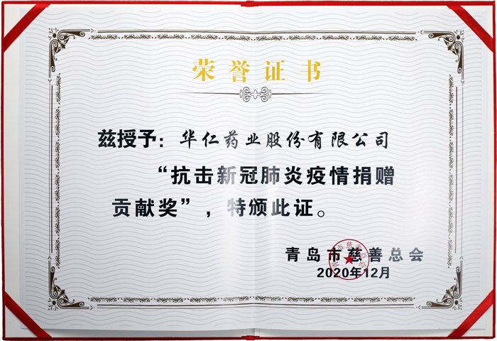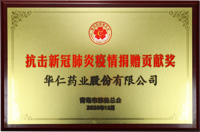 面對(duì)突如其來的新冠肺炎疫情,華仁藥業(yè)作為國有控股醫(yī)藥上市企業(yè),牢記為人類健康服務(wù)的使命初心,積極踐行社會(huì)責(zé)任與擔(dān)當(dāng),勇敢逆行,堅(jiān)守崗位,以實(shí)際行動(dòng)為抗擊疫情貢獻(xiàn)綿薄之力。經(jīng)過組織評(píng)選,青島市慈善總會(huì)授予華仁藥業(yè)股份有限公司“抗擊新冠肺炎疫情捐贈(zèng)貢獻(xiàn)獎(jiǎng)”榮譽(yù)稱號(hào)。